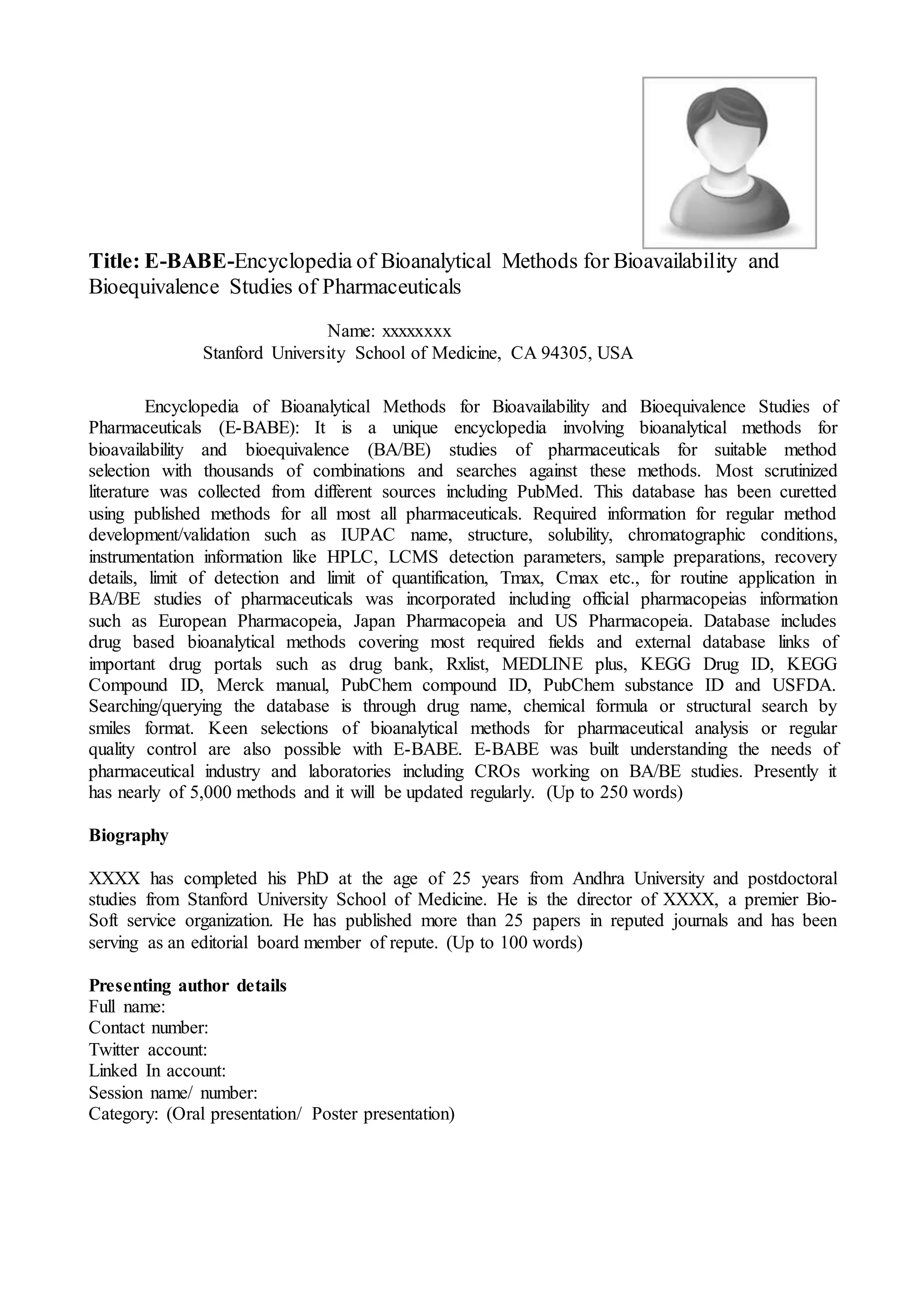 The document describes E-BABE, an encyclopedia of bioanalytical methods for studying the bioavailability and bioequivalence of pharmaceuticals. It contains over 5,000 thoroughly curated methods from literature and pharmacopeias. Each method includes details needed for development/validation, like chemical structure, analytical conditions, and pharmacokinetic parameters. Users can search by drug name, chemical formula, or structure to select appropriate quality control and bioequivalence study methods. E-BABE aims to support the pharmaceutical industry and testing laboratories in selecting bioanalytical methods.