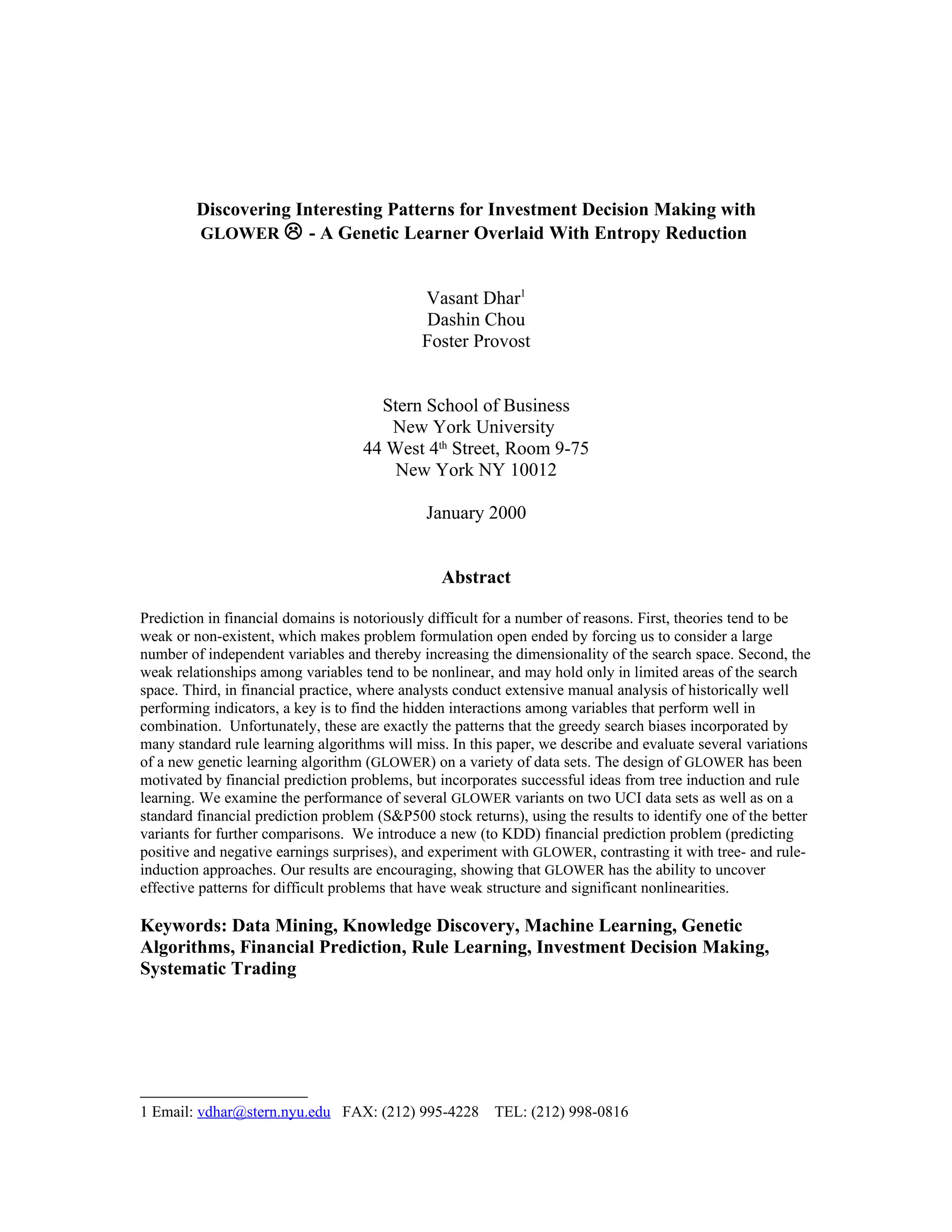 This document describes a genetic learning algorithm called GLOWER that is designed for financial prediction problems. It discusses how financial prediction is difficult due to high dimensionality, weak nonlinear relationships between variables, and important variable interactions. Standard algorithms like decision trees are limited by their greedy search approach, which can miss complex patterns. Genetic algorithms can perform a more thorough search without biases. The paper evaluates GLOWER on several datasets and finds it uncovers more effective patterns than other algorithms for difficult problems with weak structure.