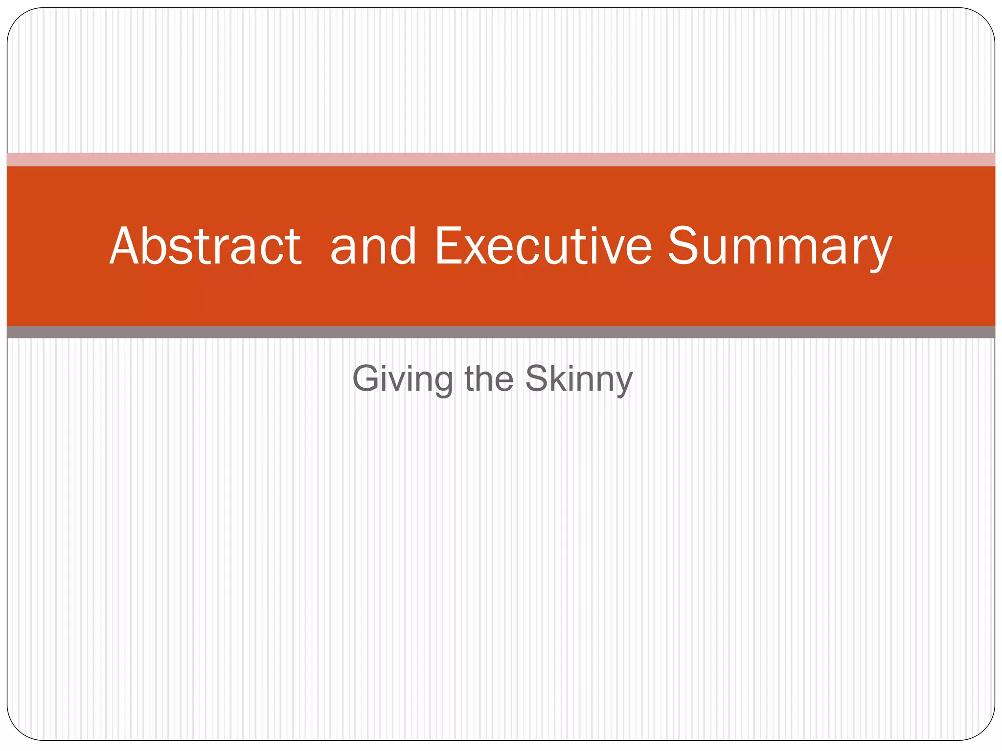 This document provides information on writing abstracts and executive summaries. It defines an abstract as a brief summary that allows readers to quickly understand the key points of a longer document, while an executive summary provides a more detailed high-level overview. The document outlines the components and characteristics of well-written abstracts and executive summaries, such as being concise, accurate and including the purpose, methods, scope, conclusions and recommendations. It also provides examples and tips for writing abstracts and executive summaries.