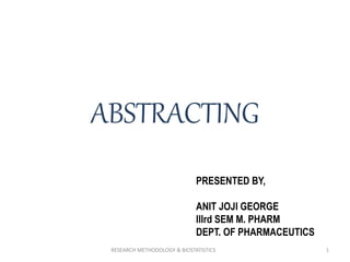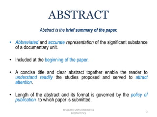 The document discusses the importance of abstracts in research papers, defining them as concise summaries that allow readers to quickly understand the essence of the studies. It outlines various types and forms of abstracts, along with considerations for their composition, emphasizing clarity, brevity, and self-containment. The need for an abstract is highlighted in terms of communication, evaluation, and aiding researchers in reviewing pertinent studies.