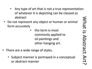 Abstract art is any art that does not accurately represent objects, humans, or animals, but rather portrays its subject matter in a conceptual or abstract manner using geometric shapes, lines, and colors. There are several styles of abstract art including abstract expressionism, action painting, color field, cubism, and neoplasticism. Cubism represents objects using geometric forms like spheres, cones and cylinders, while neoplasticism uses only vertical and horizontal lines and primary colors.