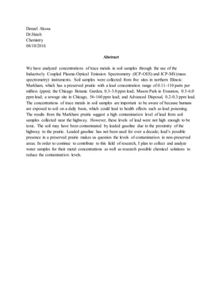 Soil samples were collected from five sites in northern Illinois and analyzed for trace metal concentrations using ICP-OES and ICP-MS instruments. The sites showed varying levels of lead concentration, from 0.11-110 parts per million at a prairie site to 56-160 ppm at a sewage site. While high levels near a highway suggested contamination from leaded gasoline, the levels were not toxic. Going forward, the author plans to analyze metal levels in water samples and research ways to reduce contamination.