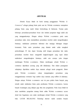 Dokumen ini membahas penggunaan website e-commerce sebagai peluang bisnis yang belum berkembang di Indonesia namun memiliki potensi besar. E-commerce dapat membantu perusahaan dalam mengembangkan bisnis, memperluas pemasaran, dan menjaga hubungan dengan konsumen. Meskipun terdapat kendala seperti infrastruktur dan kurangnya sumber daya manusia yang terampil, pemanfaatan teknologi internet di Indonesia semakin meningkat.