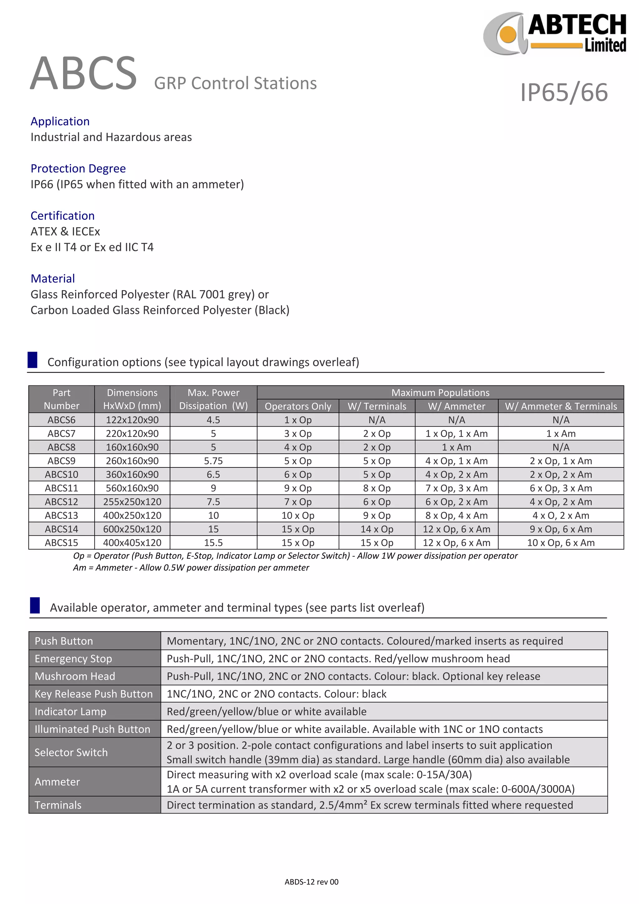 This document provides specifications for ABCS control stations used in industrial and hazardous areas. It lists the available parts including push buttons, emergency stop buttons, indicator lamps, and selector switches. It provides details on enclosure sizes, maximum populations for each part, IP protection ratings, and certifications. Installation and electrical data is also included to aid in ordering and configuration of the control stations.