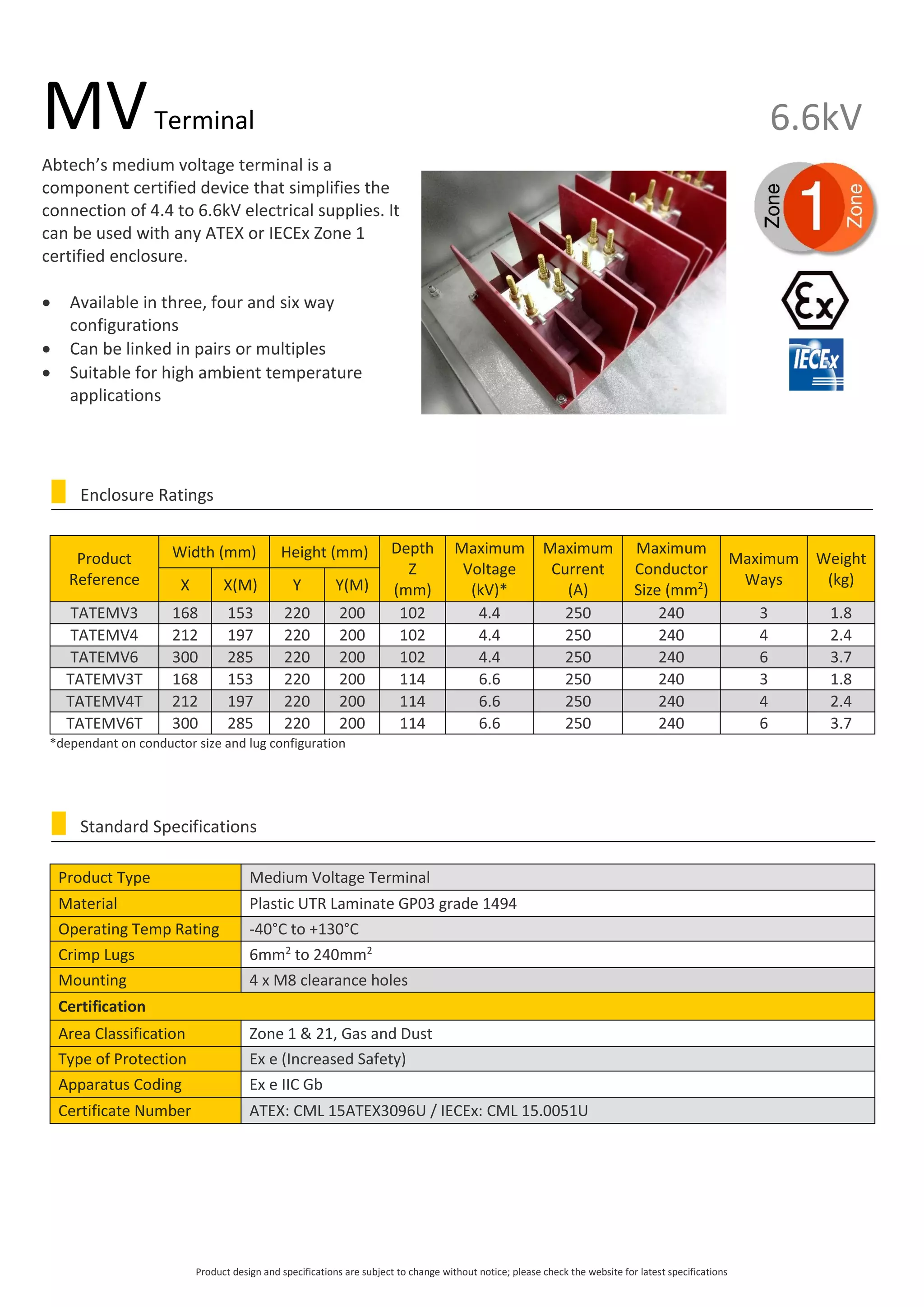 The document provides specifications for Abtech's medium voltage terminal blocks, including: - They are available in 3, 4, and 6 way configurations for connecting 4.4-6.6kV electrical supplies to any ATEX or IECEx Zone 1 certified enclosure. - Models can withstand operating temperatures from -40°C to +130°C and are made of plastic and laminate materials. - They have certification for use in Zone 1 & 21 hazardous areas and types of protection including increased safety. - Options include linking terminals in pairs or multiples.