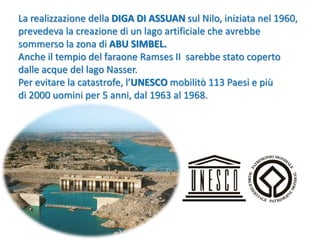 La diga di Assuan, costruita negli anni '60, ha minacciato il sito archeologico di Abu Simbel, che comprende i templi faraonici di Ramses II e Nefertari. Per salvaguardare il complesso, l'UNESCO ha orchestrato un'imponente operazione di smontaggio e ricostruzione tra il 1963 e il 1968, riposizionando i templi in un luogo più sicuro. Abu Simbel è famoso per le sue statue monumentali e il fenomeno astronomico che illumina il volto di Ramses II due volte all'anno.