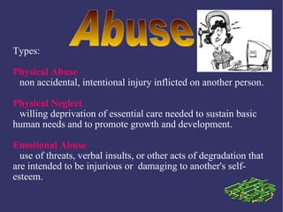 This document discusses various types of child abuse, elder abuse, domestic violence, and rape. It describes physical and behavioral signs of abuse, characteristics of abusers and victims, goals of nursing intervention which include establishing safety, education, and referring clients to counseling and community resources for long-term support.