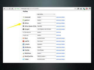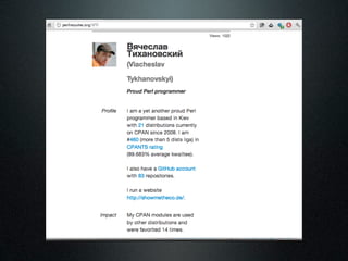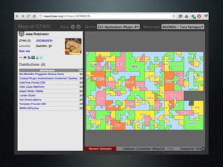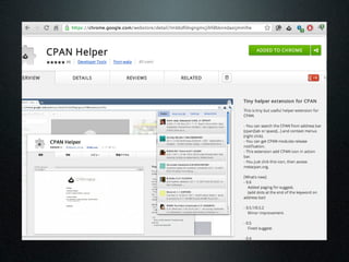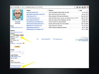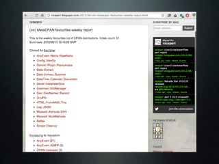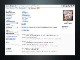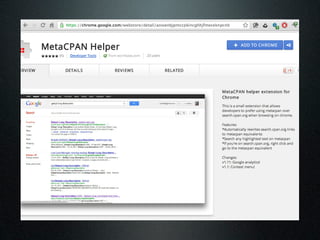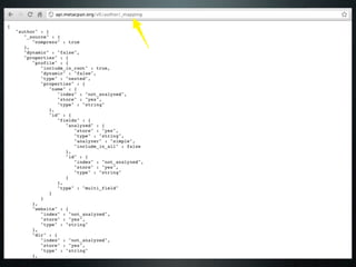 The document discusses using the MetaCPAN API to retrieve and filter data from the MetaCPAN database. It provides examples of using the API to fetch author data for a specific author, search for authors by profile or country, and filter results. It also covers more advanced techniques like using Boolean filters, sorting results, and pagination via the scrolling API. Additional resources and tips are provided, such as caching responses and enabling compression.
