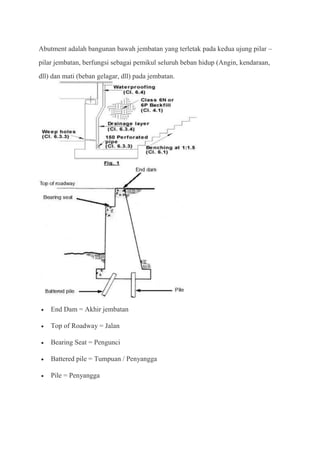 Abutment adalah bagian bangunan bawah jembatan yang berfungsi sebagai penyangga seluruh beban hidup dan mati pada jembatan. Abutment terletak di ujung-ujung pilar jembatan dan menggunakan bantalan karet untuk menerima beban dari geladak jembatan serta mengurangi getaran. Bantalan karet ini terbuat dari campuran karet dan neoprene yang diperkuat pelat baja.