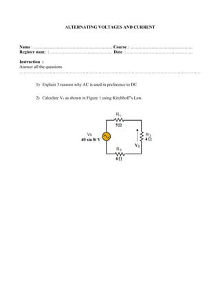 Alternating voltages and currents change polarity periodically and are used in power transmission and distribution. Kirchhoff's law states that the algebraic sum of voltages around a closed loop is zero. In circuit shown in Figure 1, the voltage V3 is calculated using Kirchhoff's law.