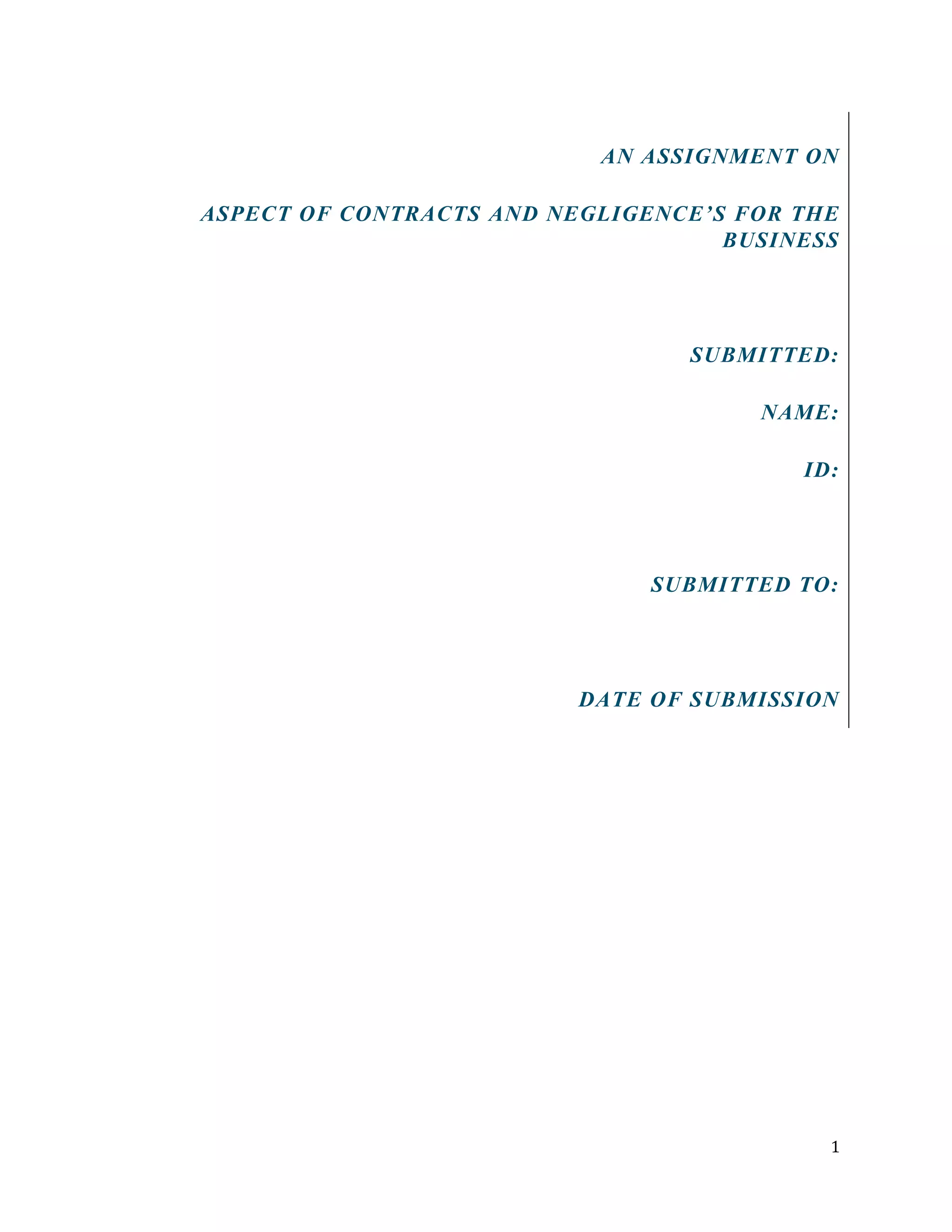 This document discusses aspects of contracts and negligence for business. It analyzes the essential elements of a valid contract, different types of contracts and their impacts, and terms included in contracts. It then applies these contract principles to the scenario of TAM's College contracting with NAMS marketing firm. It also contrasts liability in tort versus contract, discusses the nature of liability in negligence and vicarious liability in business. Finally, it applies the principles of negligence tort, defenses against negligence, and vicarious liability to the scenario of a non-teaching staff member of TAM's College getting injured.