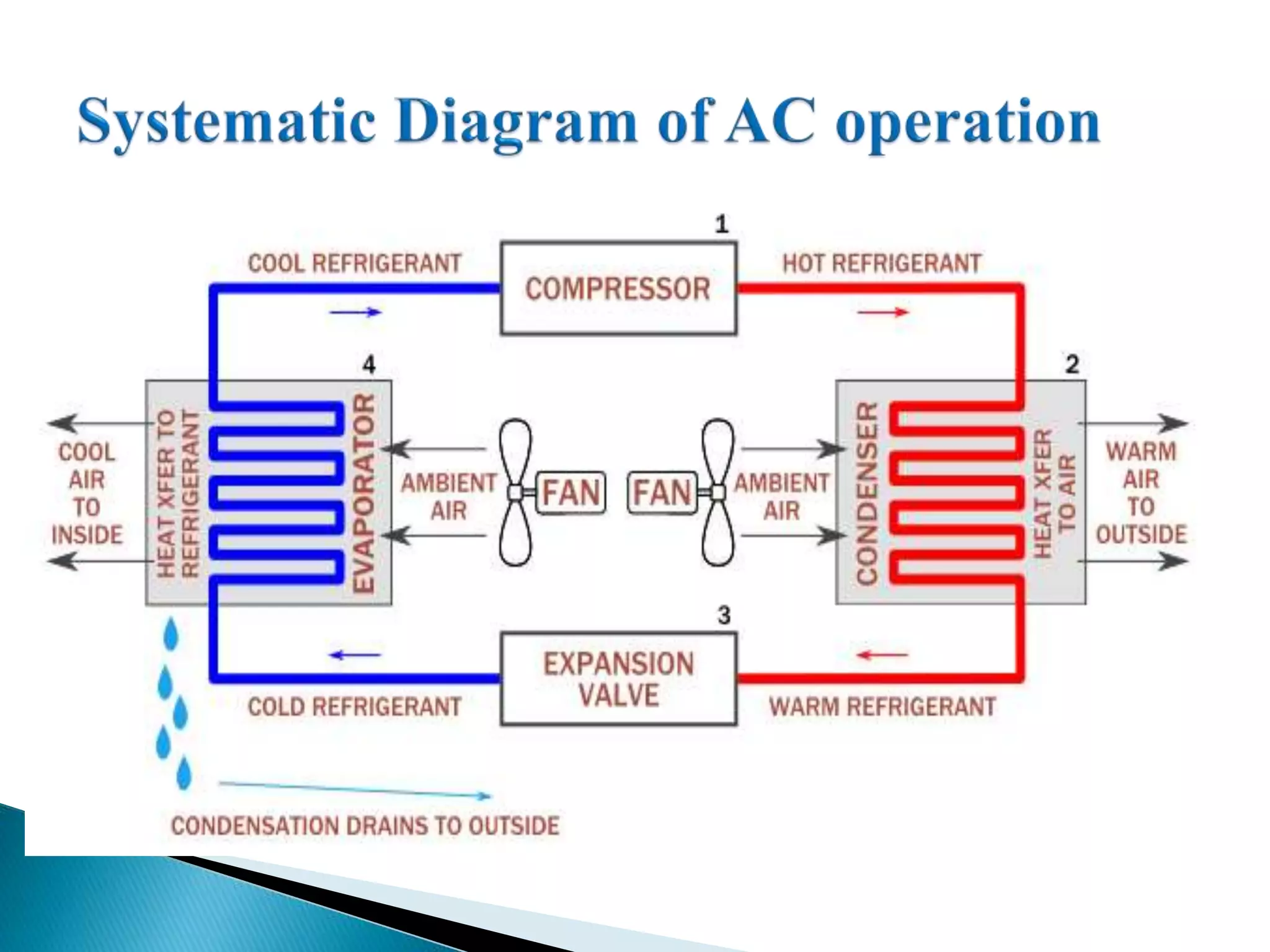 The document summarizes the history and operation of air conditioning systems. It discusses how the first modern air conditioning system was invented in 1902 by Willis Carrier to solve a humidity problem. It explains that air conditioners and refrigerators work in a similar way using a refrigerant to transfer heat from the inside to outside air. It also outlines the key components of an air conditioning system including the compressor, condenser, evaporator, blower, and thermostat. Finally, it discusses factors that determine the proper sizing of an air conditioner like home size, insulation, and heat loads.