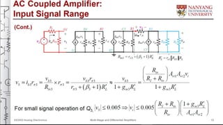 This document discusses a 3-stage AC-coupled amplifier. It consists of a common-collector (C-C) amplifier, followed by common-source (C-S) and common-emitter (C-E) amplifiers. Capacitors are used for AC coupling between stages to isolate the DC levels while allowing the transfer of AC signals. Bypass capacitors are also used to maximize voltage gain from the inverting amplifiers. The small-signal equivalent circuit is derived and used to determine the overall output resistance of the multi-stage amplifier configuration. Finally, general formulas are presented for calculating input resistance, output resistance, and voltage gain for N-stage amplifiers.