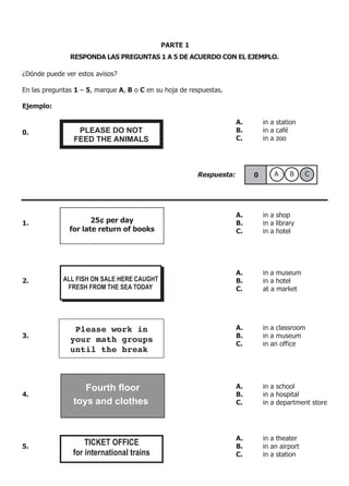 This document contains an example test for an English exam with 7 parts. It includes multiple choice questions testing comprehension of short passages about various topics like family members' lives in different countries and an article about the uses of the Guadua plant in Colombia. The test assesses vocabulary, reading comprehension, and the ability to infer correct answers based on provided information.
