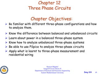 This document provides an overview of key concepts in three-phase circuits. It discusses different three-phase configurations including wye, delta, and their combinations. Balanced and unbalanced three-phase systems are examined. The objectives are to understand how to analyze three-phase circuits, distinguish between balanced and unbalanced systems, apply concepts to power calculations and measurements, and simulate three-phase circuits in PSpice. Diagrams demonstrate voltage and current relationships in various three-phase connections.