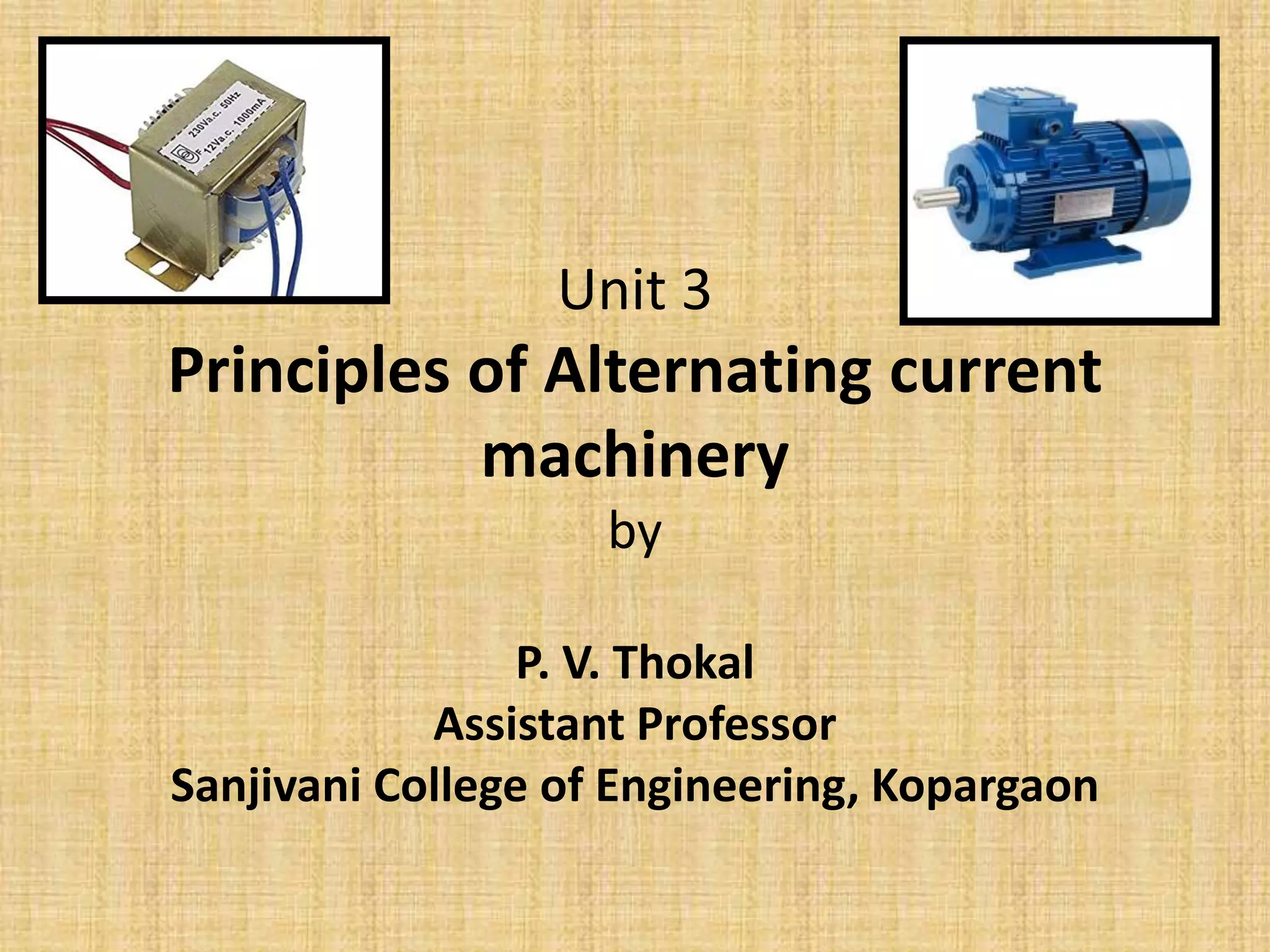 Unit 3 of the document covers principles of alternating current machinery, including inductance, capacitance, and impedance. It discusses types of electrical machines like alternators and transformers, their construction, working principles, and efficiency. Additionally, it outlines three-phase induction motors, detailing their construction, operating principles, and applications.