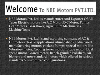 The document details a summer training program on AC motors conducted by NBE Motors Pvt. Ltd., a manufacturer and exporter of various electric motors and related equipment. It covers topics such as the introduction to induction motors, their working principles, parts, and manufacturing processes, along with various testing methods. Additionally, it explains the components of AC motors, specifically emphasizing the rotor and stator functions.