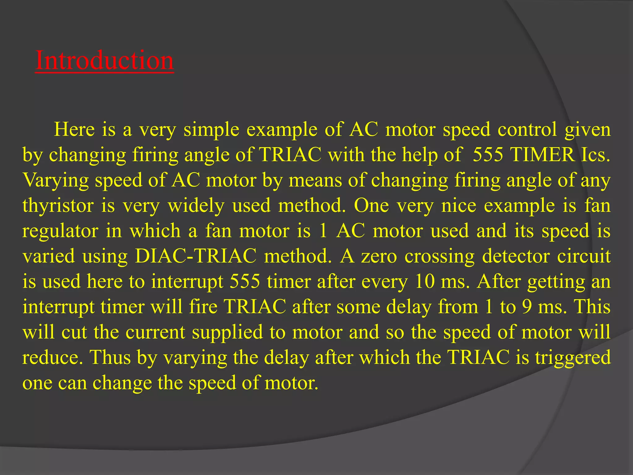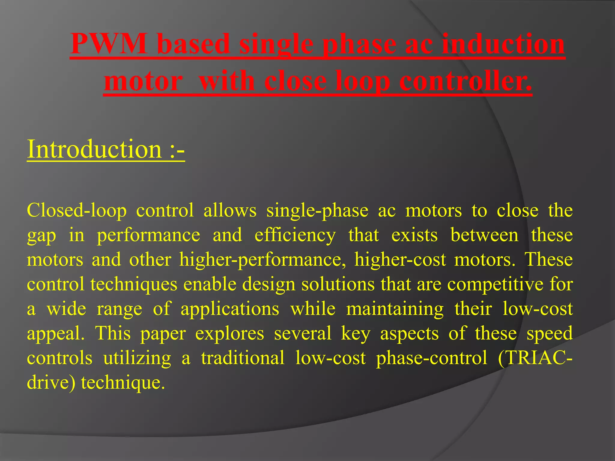 This document discusses the design of a closed-loop speed controller for a single-phase AC induction motor using pulse-width modulation (PWM) of the TRIAC firing angle. It describes how varying the TRIAC firing delay can control motor speed, and how adding a tacho generator and error amplifier in a closed control loop enables set-point speed regulation. Key components include the zero-crossing detector, PWM generator, TRIAC driver, power supply, and control loop circuitry around the motor and tacho generator.