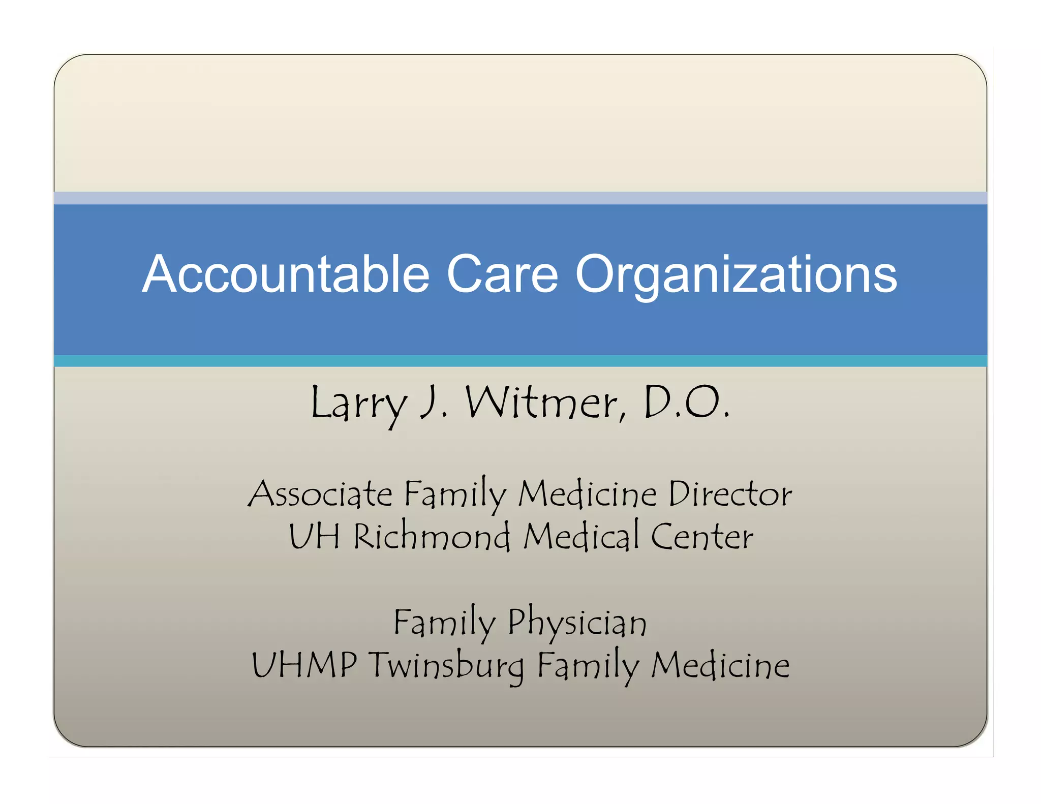 The document discusses Accountable Care Organizations (ACOs) created by the Affordable Care Act. ACOs allow groups of doctors, hospitals, and other providers to share responsibility for the cost and quality of care received by their patients. If ACOs meet quality benchmarks and reduce costs, they receive a share of the savings from insurers. The document outlines key features of ACOs such as local accountability, shared savings based on quality and cost measures, and a minimum of a 3-year contract period with Medicare.