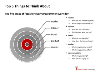 The document outlines five key focus areas for radio programmers: market competition, understanding the listener, brand identity, product communication, and effective outreach. It emphasizes the importance of knowing the audience, enhancing on-air and digital presence, and building a strong brand that resonates with listeners. Additionally, it promotes an upcoming book titled 'Radio Warfare,' which provides strategies for competitive radio programming based on years of experience.