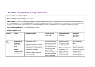 The document outlines an educational scheme titled 'Future Perfect,' aimed at students creating a collaborative mosaic mural while exploring sustainable development goals related to oceans. Through various art techniques, the project emphasizes the importance of creativity, environmental awareness, and social inclusiveness. It includes lesson plans detailing objectives such as understanding marine biodiversity and the role of art in promoting themes of unity and sustainability.