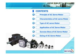 The document discusses AC servo motors. It covers the principle, characteristics, types, applications and sizing of AC servo motors. Some key points include: