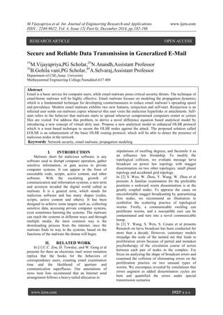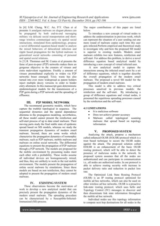The document discusses a novel analytical model to address the propagation dynamics of modern email malware, focusing on its features like reinfection and self-start. It proposes an enhancement to the Optimized Link State Routing (OLSR) protocol, named eolsr, which improves network security by detecting malicious nodes. The research highlights the importance of understanding malware behaviors and suggests that the proposed models can better capture the complexities of malware propagation compared to existing systems.