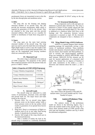 The document presents a linear static analysis of a carbon fiber reinforced polymer (CFRP) aircraft wing to evaluate stresses and displacements. The study highlights the advantages of CFRP materials over traditional metals in terms of strength-to-weight ratio and stiffness, and the results indicate that the refined wing model meets permissible stress limits and can effectively support the aircraft's structural requirements. The analysis was conducted using finite element modeling in ANSYS and demonstrated improved performance compared to the preliminary model.