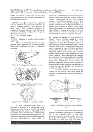 This document reviews various drive mechanisms of bicycles and tricycles to enhance their operating performance and efficiency. It discusses the importance of mechanical advantage, various patented innovations, and experimental findings aimed at optimizing cycle performance, such as adjusting sprocket diameters and utilizing automatic chain tensioning units. The paper concludes that the efficiency of drive mechanisms can significantly improve through innovative designs and adjustments to mechanical parameters.