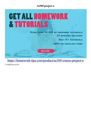 This document provides information about project A for the AC505 course. The project involves analyzing financial statements for a public company and writing a report on the company's performance and financial position. Students are instructed to choose a public company, obtain its annual report, and analyze the income statement, balance sheet, statement of cash flows, and notes to financial statements to complete the required report.