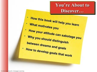 The document discusses building dreams and setting goals. It introduces how the book will help the reader learn, what motivates them, how attitude can sabotage goals, and why distinguishing between dreams and goals is important. It also discusses developing goals that work, surrounding yourself with motivated people, and assessing internal versus external motivation.