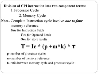 This document discusses various attributes that influence computer system performance. It covers topics like instruction count, cycles per instruction, processor cycle time, memory access latency, and how factors like instruction set architecture, compiler technology, processor implementation, and memory hierarchy can affect these performance attributes and metrics like instructions per second. It also summarizes different types of parallel computer architectures like shared-memory multiprocessors, distributed-memory multicomputers, vector supercomputers and SIMD machines.