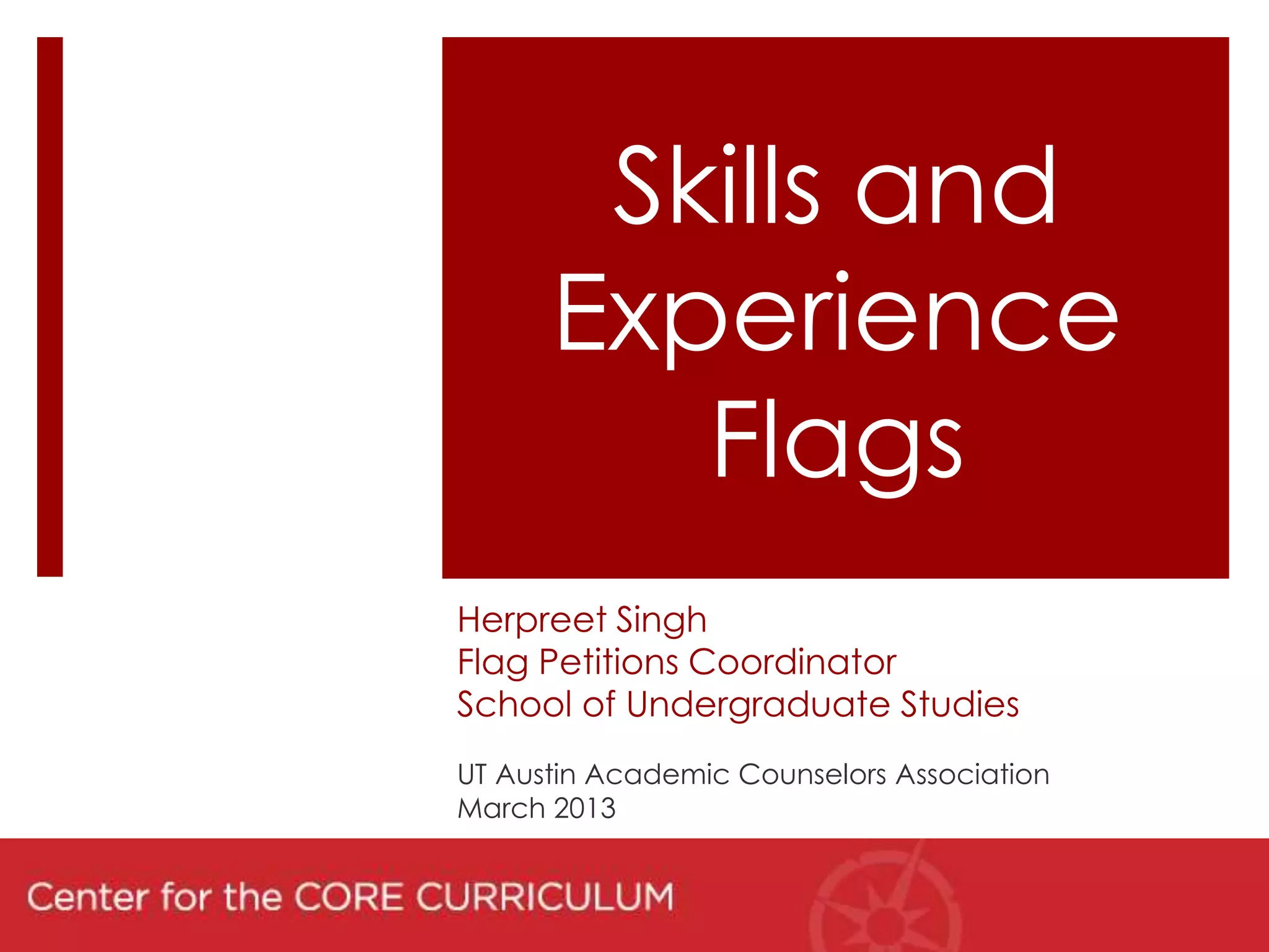 The document outlines UT Austin's skills and experience flag program which requires students to complete courses in seven flagged areas as part of their general education requirements, describes the criteria and implementation of each flag, and provides resources for advisors and students regarding the flag petition process.