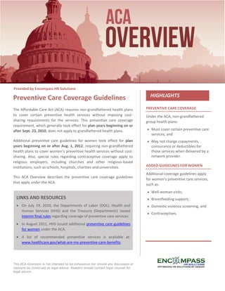 The document outlines the preventive care coverage requirements under the Affordable Care Act (ACA), mandating non-grandfathered health plans to cover certain preventive services without cost-sharing, including specific guidelines for women's health services effective from 2012. It emphasizes coverage for various preventive services including routine screenings, immunizations, and tobacco cessation interventions, while indicating that grandfathered plans and out-of-network services may still incur costs. It also describes exemptions for religious employers regarding contraceptive services and outlines the temporary safe harbor and accommodations for nonprofit organizations that refuse to provide contraceptive coverage due to religious beliefs.