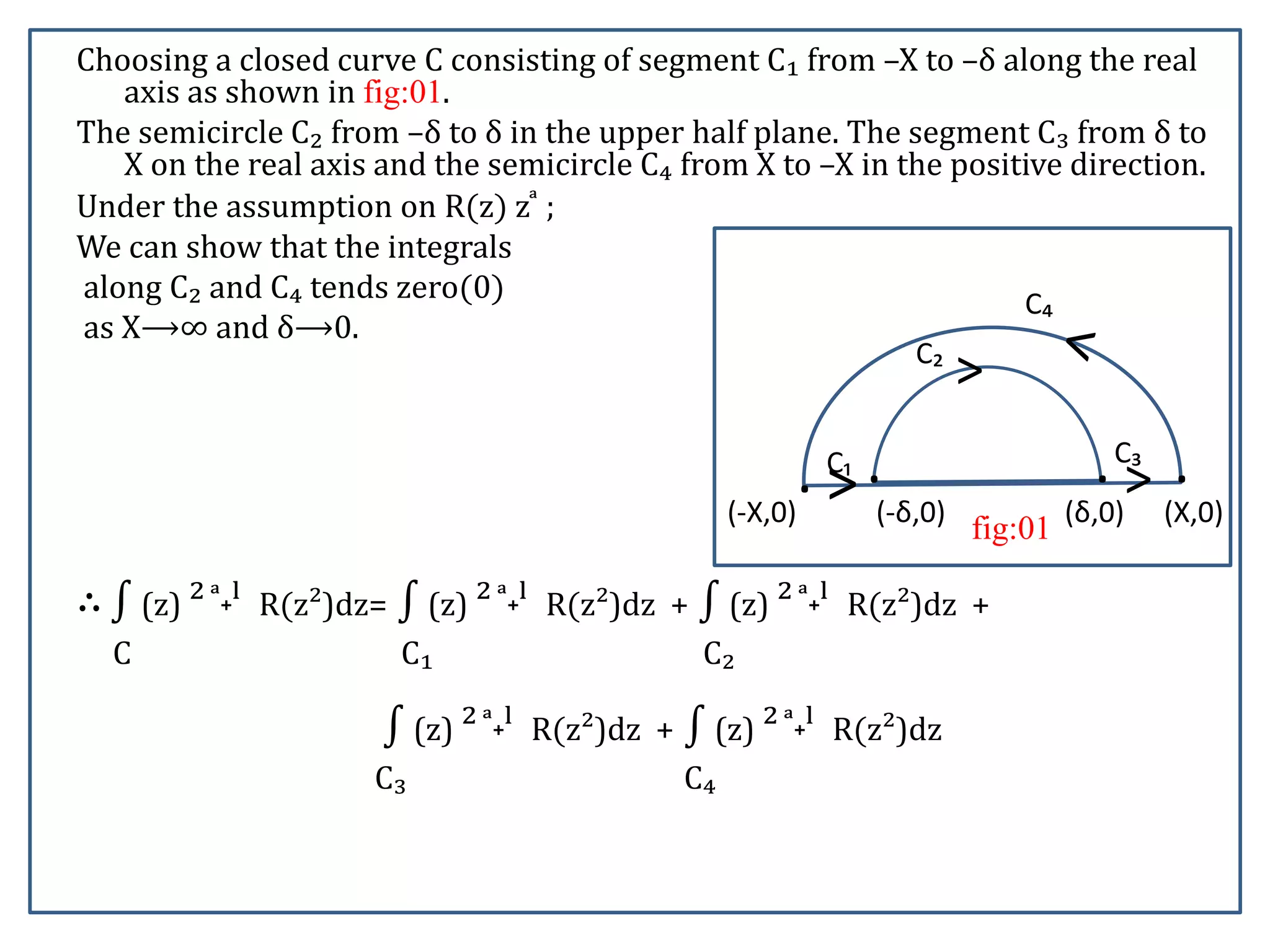 This document presents a method for evaluating integrals of the form I=x^a R(x) dx, where R(x) is a rational function with at most a simple pole at the origin and 0<a<1. It involves changing variables to write the integral in terms of a contour integral over a keyhole contour C. By taking limits, the contour integral can be written as a sum of integrals over the real segments of C. Taking another limit then allows writing the original integral I in terms of the residues of the rational function R(z). The final result obtained is that I=2πi{Σ Res z^a R(z)}/(1-2a), where the sum is over