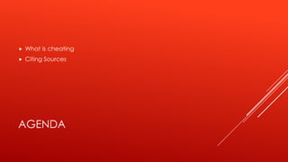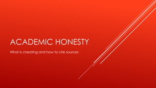 This document discusses academic honesty and proper citation of sources. It defines cheating as copying work or claiming ideas from other sources as your own. It provides examples of actions that would and would not constitute cheating. It also explains what should be included in a works cited or bibliography page, such as the author's name, book or article title, publisher, and date. Students are then assigned to work in pairs to create a sample works cited page using provided book covers and title pages as sources.