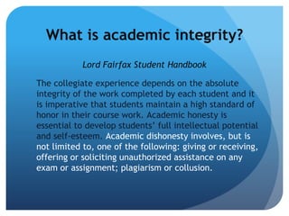 This document discusses academic integrity for online students. It defines academic integrity and dishonesty, including plagiarism and unauthorized assistance. It outlines the procedures for cases of academic dishonesty, including potential penalties assigned by the instructor like redoing work, receiving a zero, or failing the course. It then summarizes the policies in Professor Nelson's syllabus, which take academic honesty seriously and state that cheating or plagiarism will result in penalties up to failing the course. The document encourages students to focus on learning rather than distractions, and provides examples of issues with online translations.