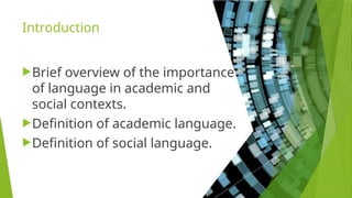 The document compares academic language, used in educational contexts for expressing formal ideas and acquiring knowledge, with social language, which is informal and used in everyday conversations. It outlines the characteristics, purposes, and examples of each type of language, emphasizing the importance of mastering both for effective communication. Additionally, it provides strategies for developing academic language skills.