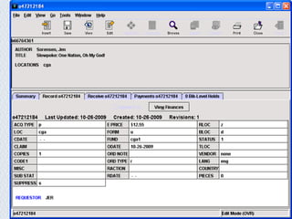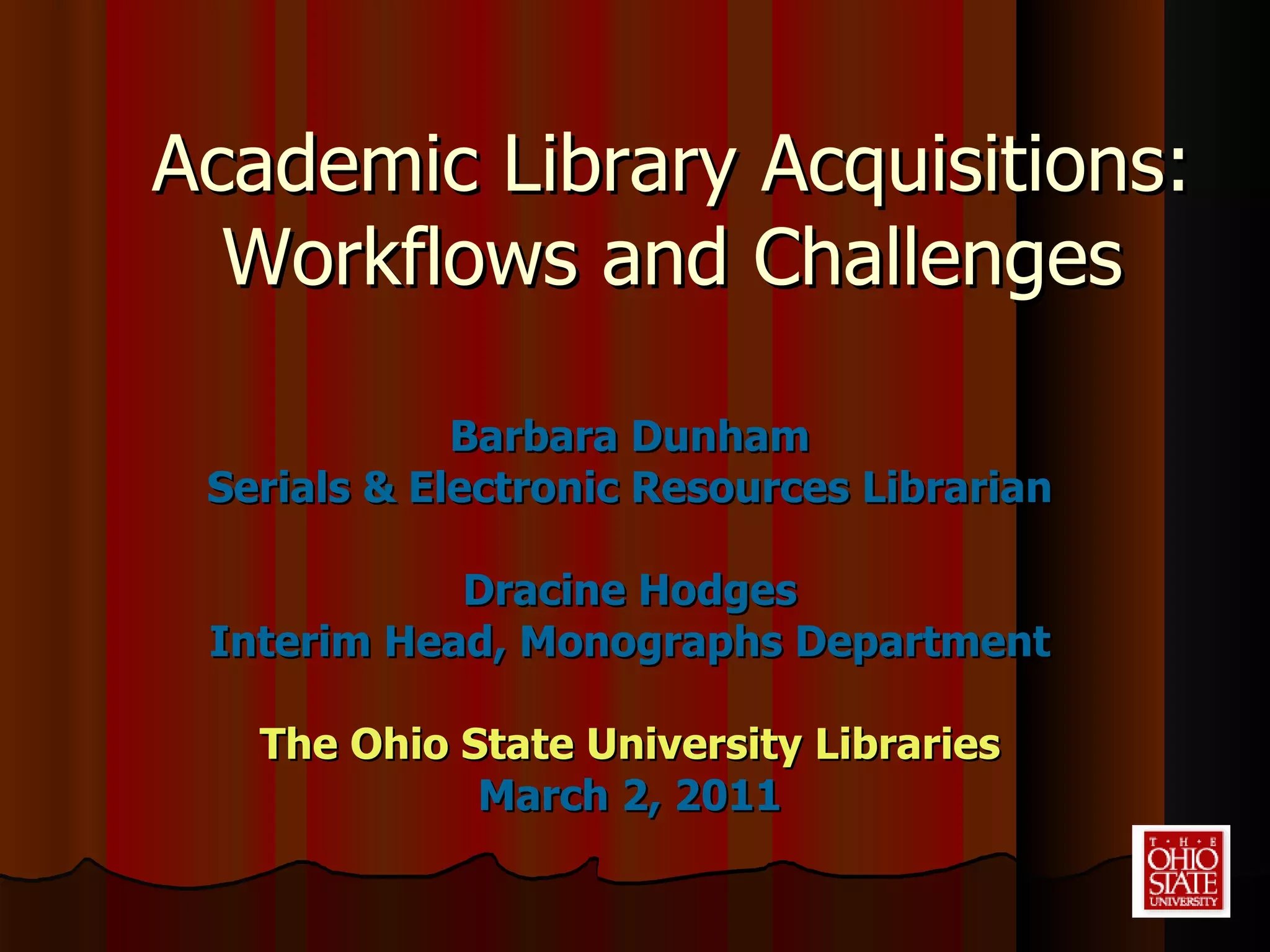 The document summarizes the workflows and challenges of academic library acquisitions at The Ohio State University Libraries. It outlines the divisions of print and electronic acquisitions departments and their staffing. It also discusses the shift to primarily electronic resources, licensing issues, various pricing and purchase models for e-journals and e-books, and tools used. Major challenges addressed are big deal packages, aggregators vs. publishers, perpetual access, and adapting selection and policies to the evolving digital environment.