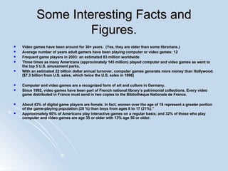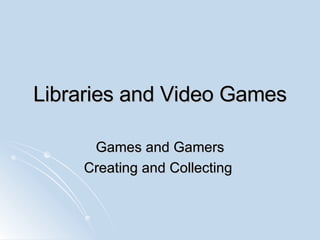 The document discusses the evolution and cultural significance of video games, indicating they have become a recognized art form and a multi-billion dollar industry, surpassing even Hollywood in annual revenue. It highlights gamer demographics, with a substantial portion of gamers being over 35 and female, and outlines the educational and social uses of games. The paper emphasizes the importance of libraries in preserving video games as part of cultural heritage, advocating for their collection in academic settings.