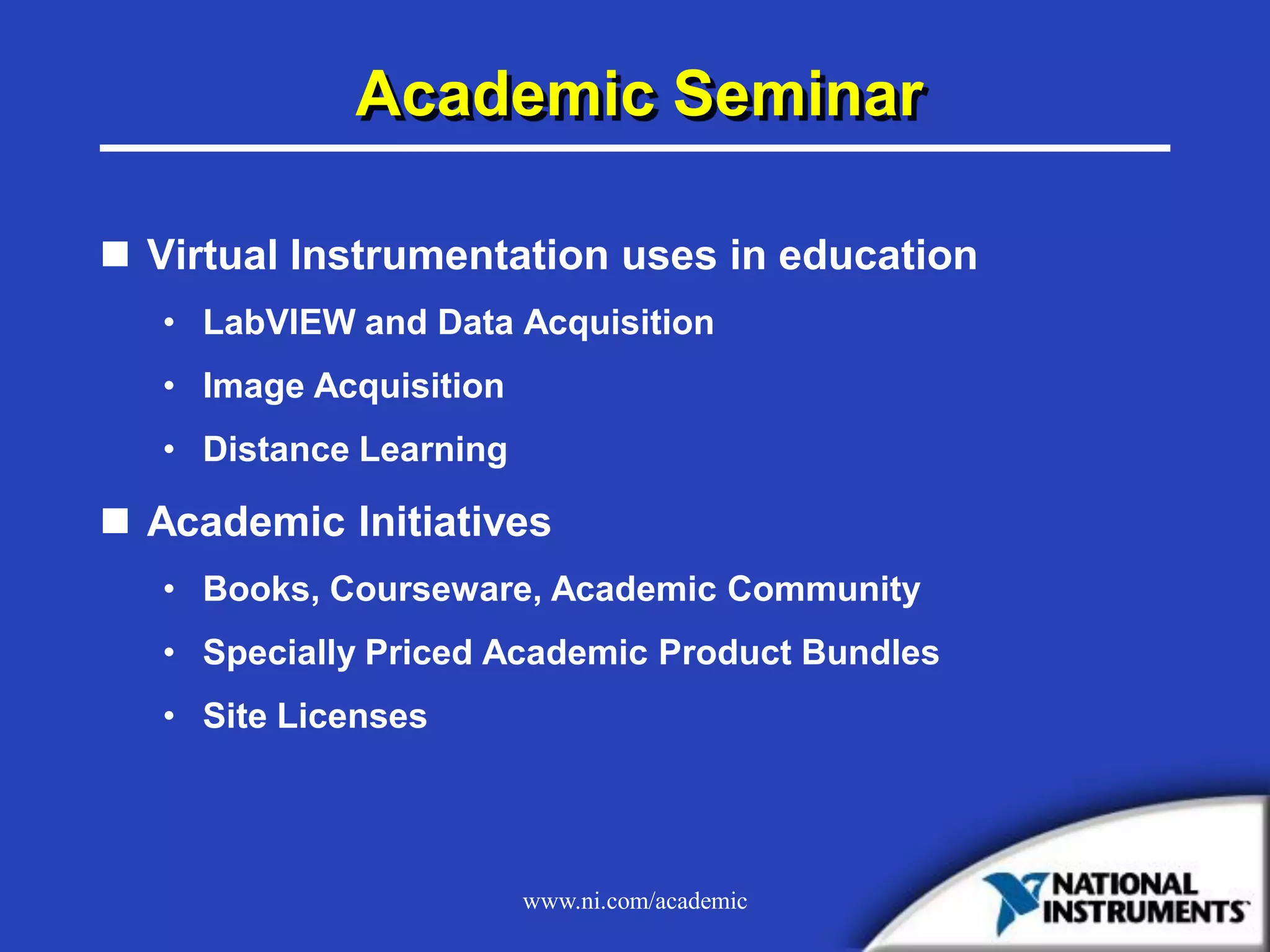 The document discusses National Instruments' academic program and virtual instrumentation solutions. It describes NI's initiatives for academic institutions including site licenses for LabVIEW, academic bundles for measurement hardware and software, courseware and resources. It provides examples of applications of virtual instrumentation in education and industry.