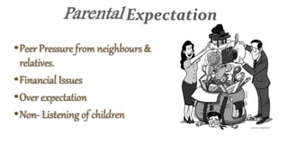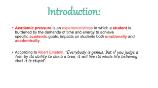 Academic pressure takes a toll on students both emotionally and academically, according to the presented document. The document notes that academic pressure stems from result-oriented expectations, overloaded schedules, and fears of failure. This pressure can lead students to perceive negative thoughts and impacts their mental health, with some students even resorting to suicide due to not being able to handle the demands. The document concludes by emphasizing the importance of time management, understanding different perspectives, and reframing academic pressure in a positive light to help students cope.