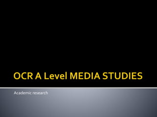 The document provides guidance on the academic research process. It discusses developing a research topic and question. Researchers must determine the scope of their work and timeline. They should use primary and secondary sources, taking detailed notes and evaluating source credibility. The drafting process involves writing a thesis, incorporating sources via quotes and paraphrasing, and revising. Researchers must follow formatting guidelines for citations and references in the final paper. Reliability of sources depends on the intended use and medium of the information. The academic research process requires determining a focused topic and question, conducting thorough research and analysis, and properly presenting findings.