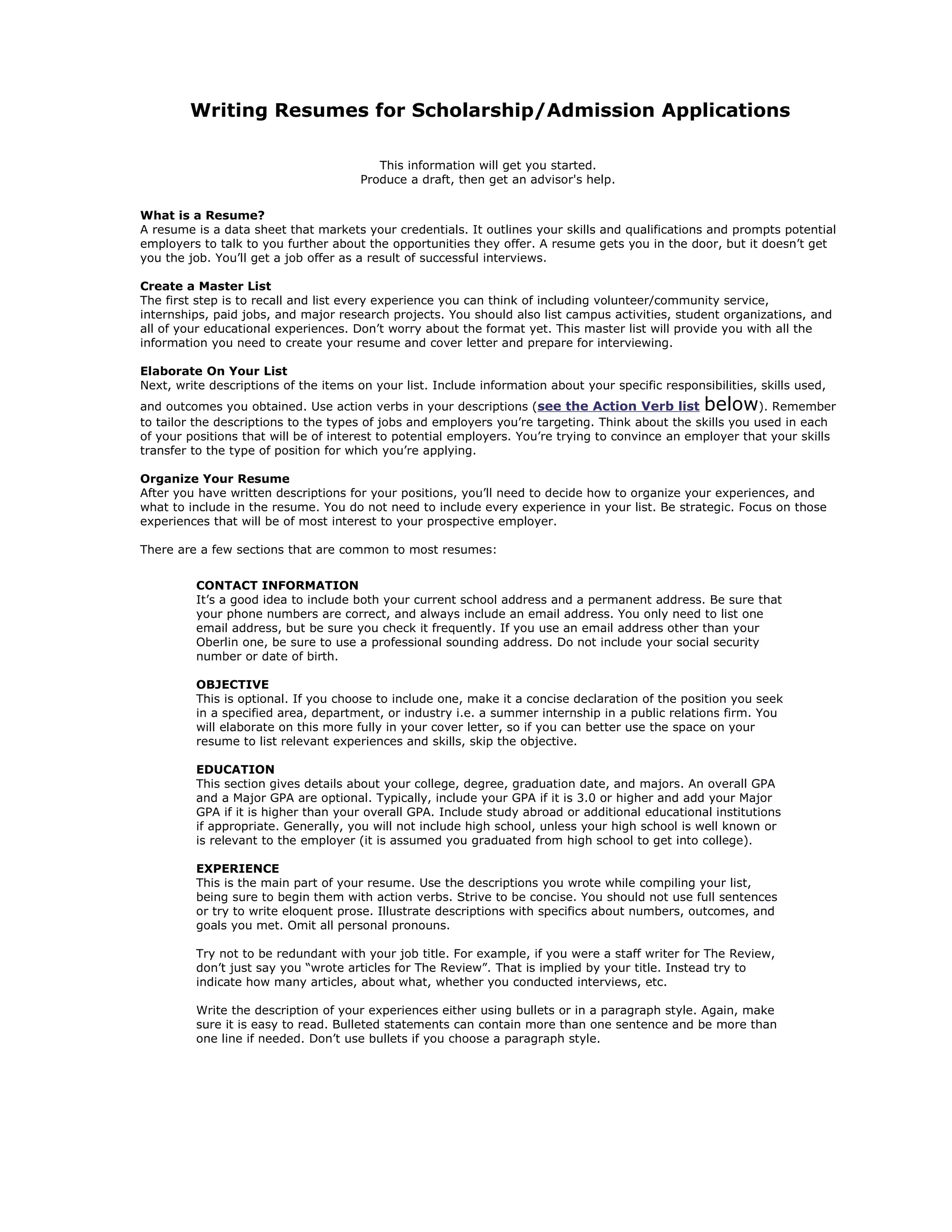 This document provides guidance on writing resumes for scholarship and admission applications. It recommends creating a master list of all relevant experiences and then elaborating on those experiences with descriptions highlighting skills and outcomes. The resume should be organized into standard sections like contact information, education, experience, and activities. Formats can include chronological, functional, or a combination. The summary emphasizes keeping the resume concise, one page if possible, with careful proofreading.