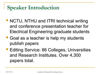The document outlines effective strategies for presenting a paper at academic conferences, including speaker introduction, preparation tips, and presentation techniques. It emphasizes the importance of engaging the audience, using visual aids, and developing confidence through practice. Additionally, it provides guidance on structuring presentations, managing timing, and connecting with attendees to enhance the overall impact of the talk.