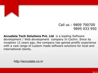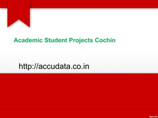 Accudata Tech Solutions Pvt. Ltd is a leading software development and web development company located in Cochin that has 12 years of experience working with local and international clients. They provide academic student live projects in mobile, web, and windows technologies to integrate real-world trends and practices into coursework. Students can participate independently in challenging projects to enhance their career prospects, expertise, and knowledge. Accudata has experience developing successful products and offers resources like labs, training, and placement assistance.