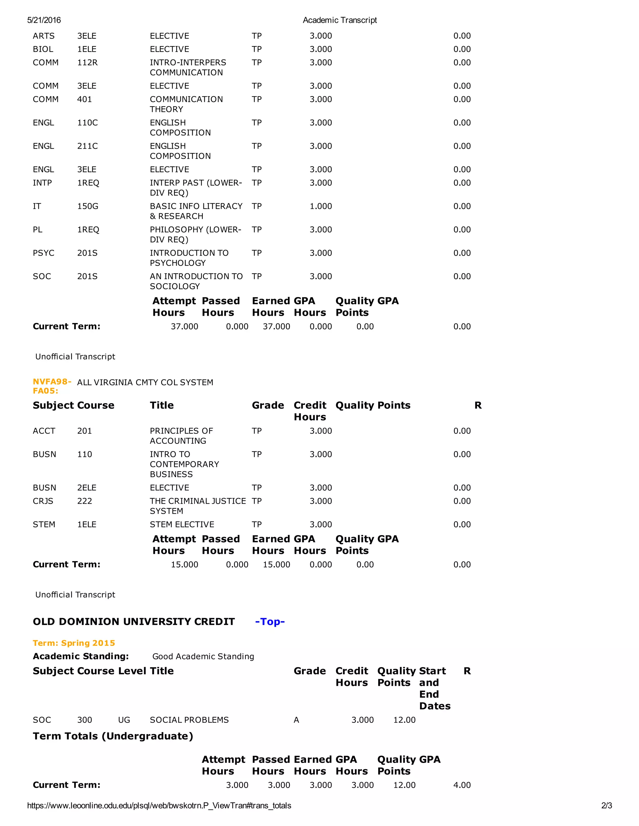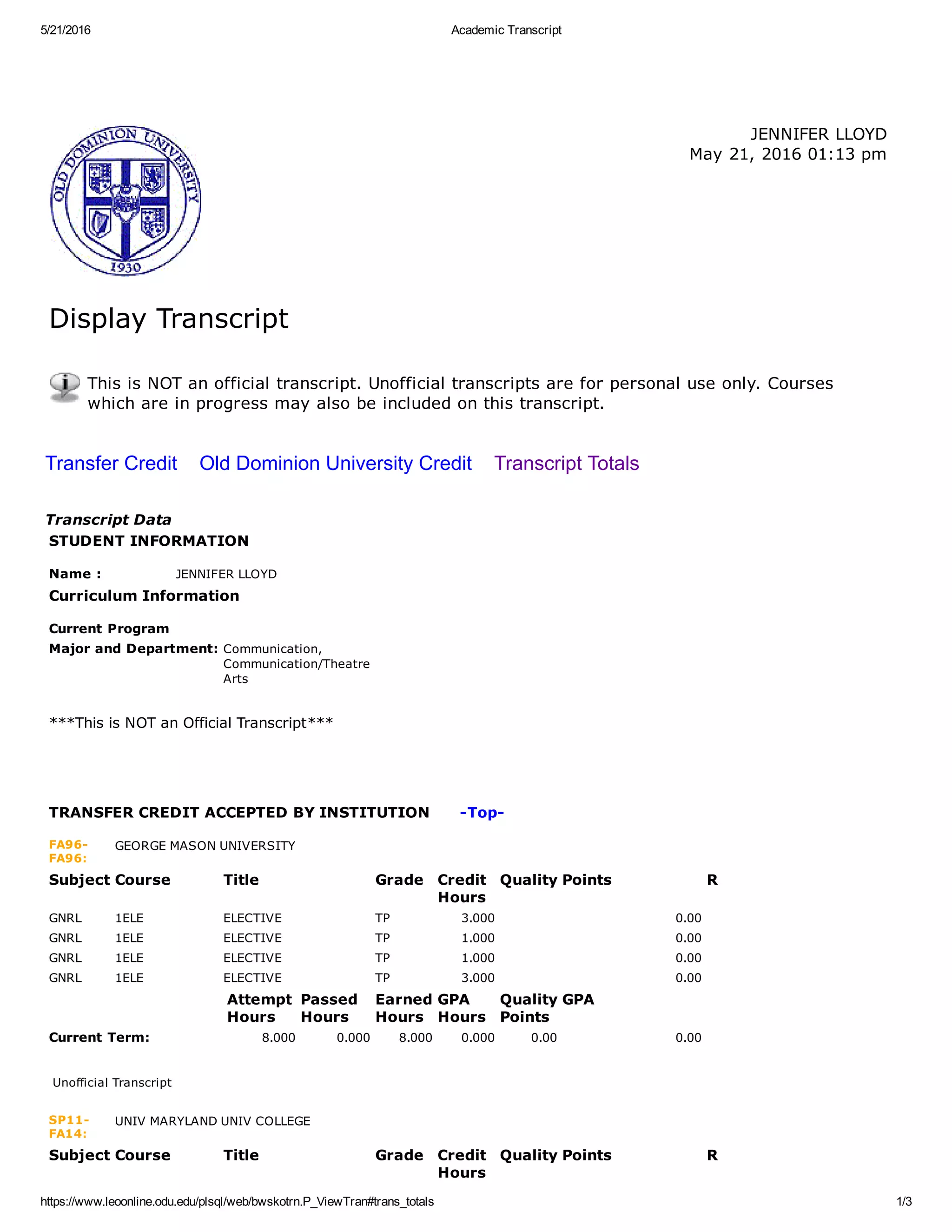 Jennifer Lloyd's unofficial transcript shows that she has completed 75 credit hours towards a Communication major, including transfer credits from George Mason University, University of Maryland University College, and Virginia Community College System. Her most recent term at Old Dominion University in Spring 2016 included grades of A- in Persuasion and A in Introduction to New Media Technologies, bringing her cumulative GPA to 3.94. The transcript notes that it is unofficial and for personal use only.