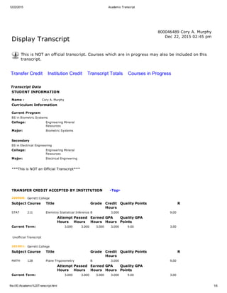 This unofficial transcript summarizes Cory A. Murphy's academic record, including 65 credits transferred from Garrett College with a GPA of 3.15. It shows his coursework at WVU, where over 117 credits were earned with a GPA of 3.24. In total, Cory earned over 177 credits with an overall GPA of 3.21 in pursuing a BS in Biometric Systems. He is currently enrolled in 6 credits for the spring 2016 term.