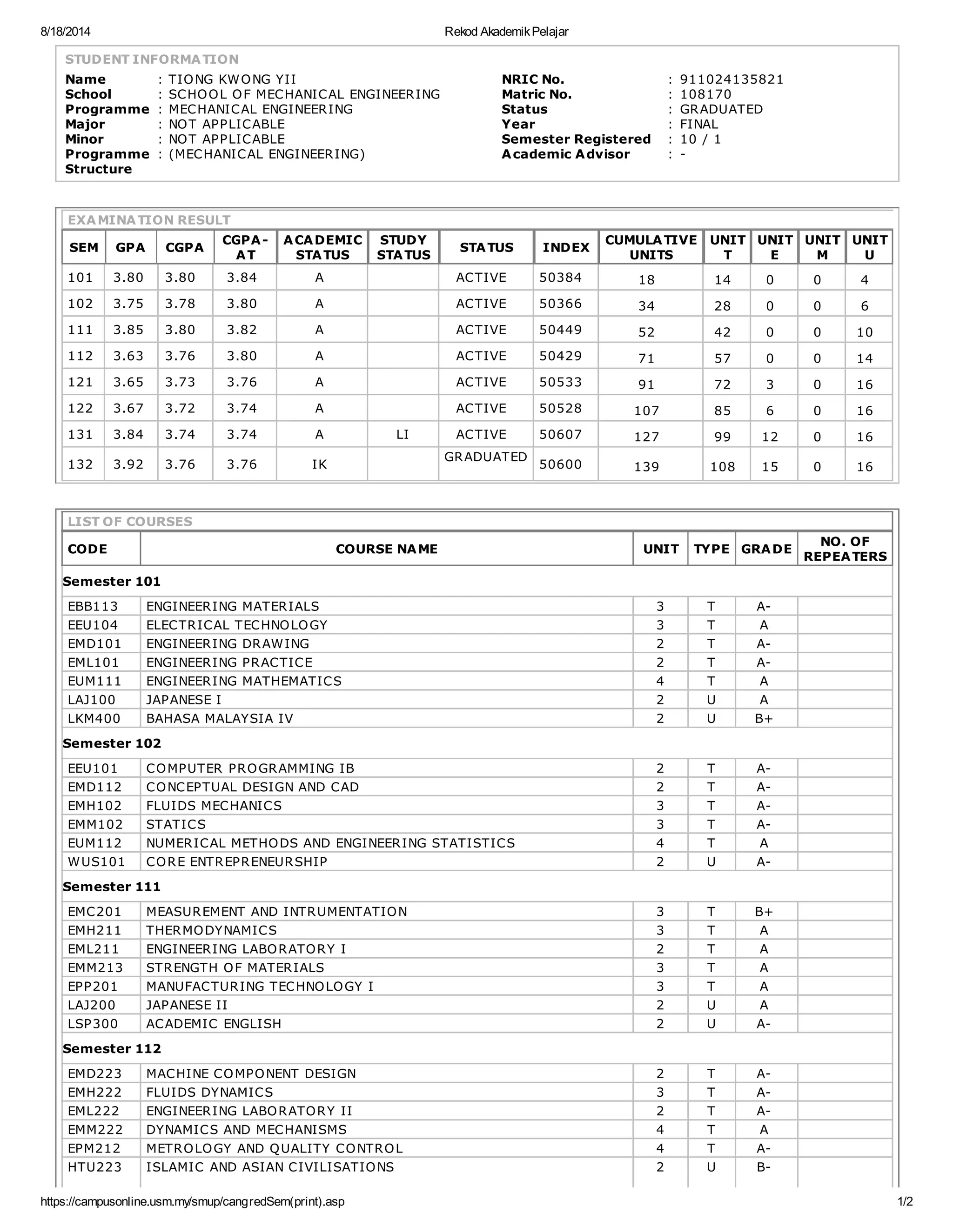 This document contains a student's academic record from the School of Mechanical Engineering at USM. It includes the student's personal information, examination results, academic status over 8 semesters, lists of courses taken each semester, and final cumulative units. The student graduated with a CGPA of 3.76, maintaining an A academic status throughout their studies and completing 139 cumulative units, fulfilling the 135 units required for graduation in the Mechanical Engineering program.
