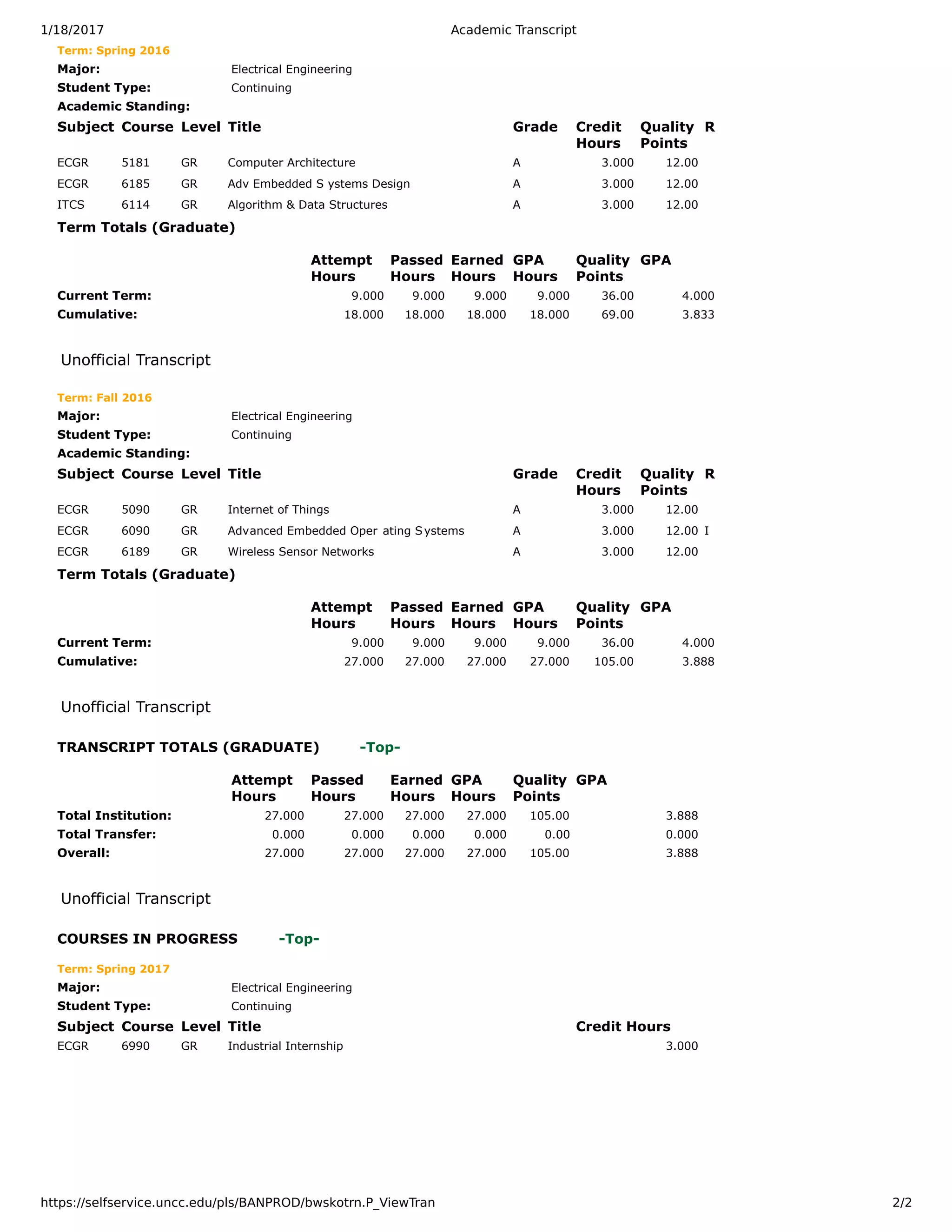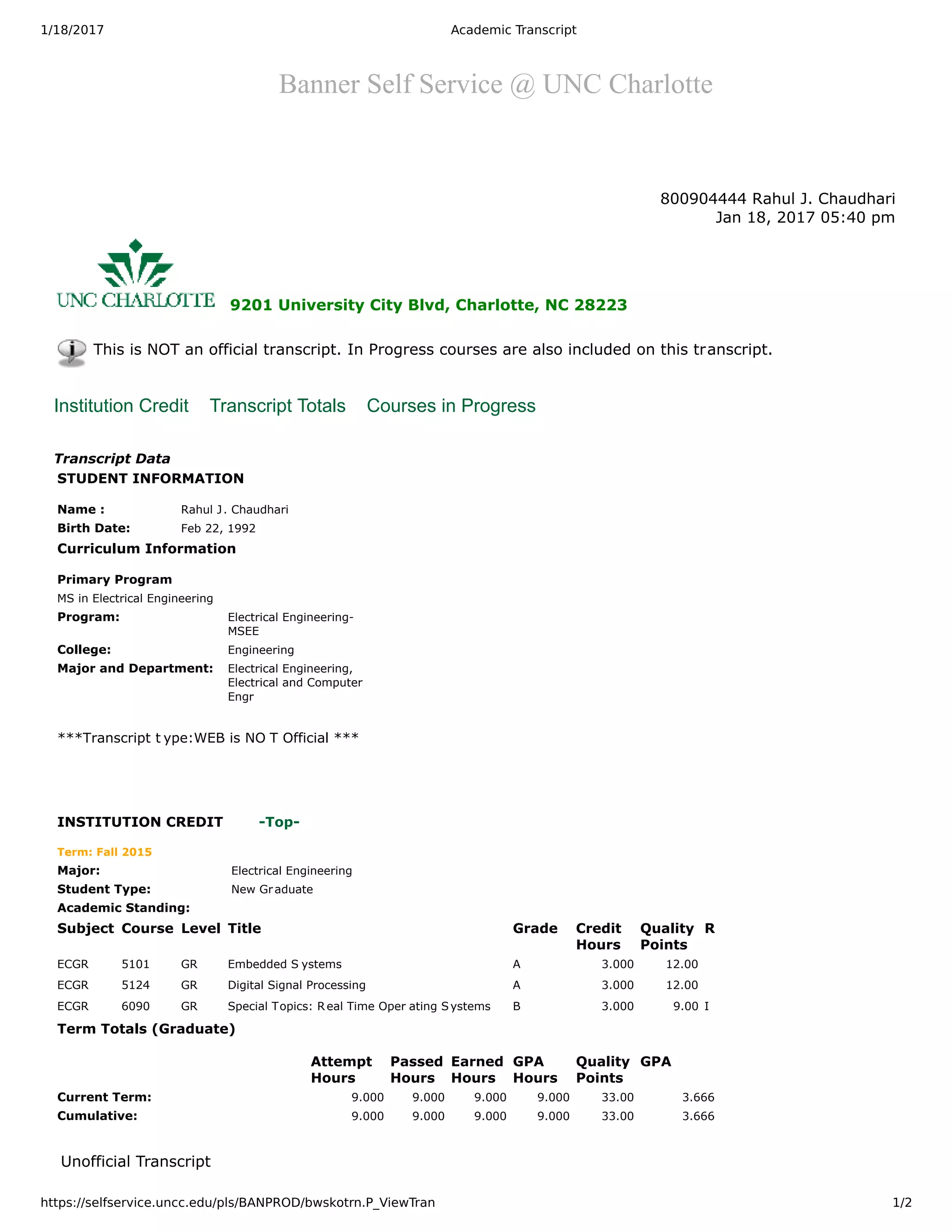 This unofficial transcript summarizes Rahul J. Chaudhari's academic progress in the Master of Science in Electrical Engineering program at UNC Charlotte. It shows that he has completed 27 credit hours over 3 semesters, earning a cumulative GPA of 3.888. His coursework has included classes in embedded systems, digital signal processing, real-time operating systems, computer architecture, advanced embedded systems design, algorithms and data structures, internet of things, and advanced embedded operating systems. He is currently enrolled in a 3 credit hour industrial internship course for the Spring 2017 semester.